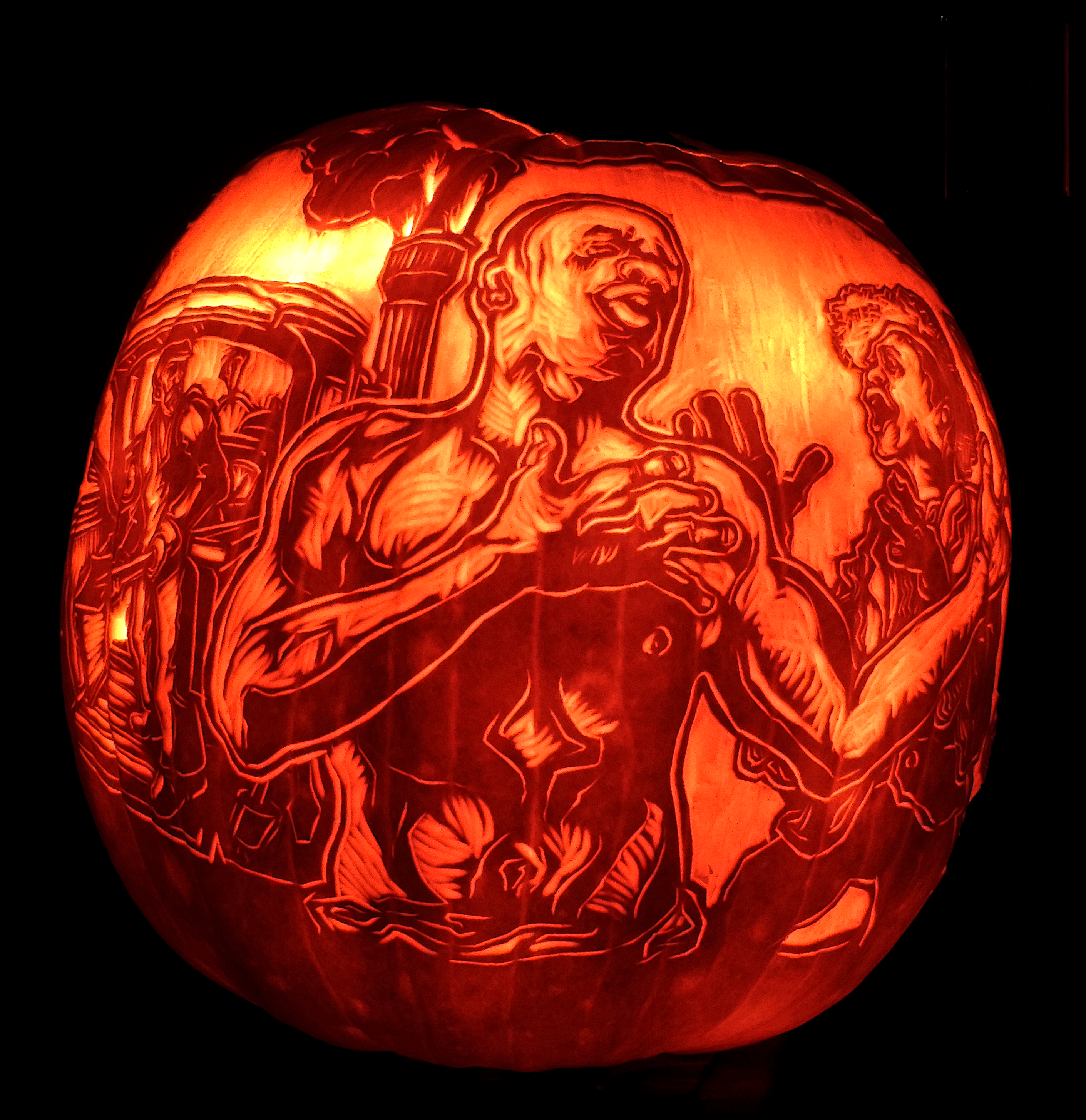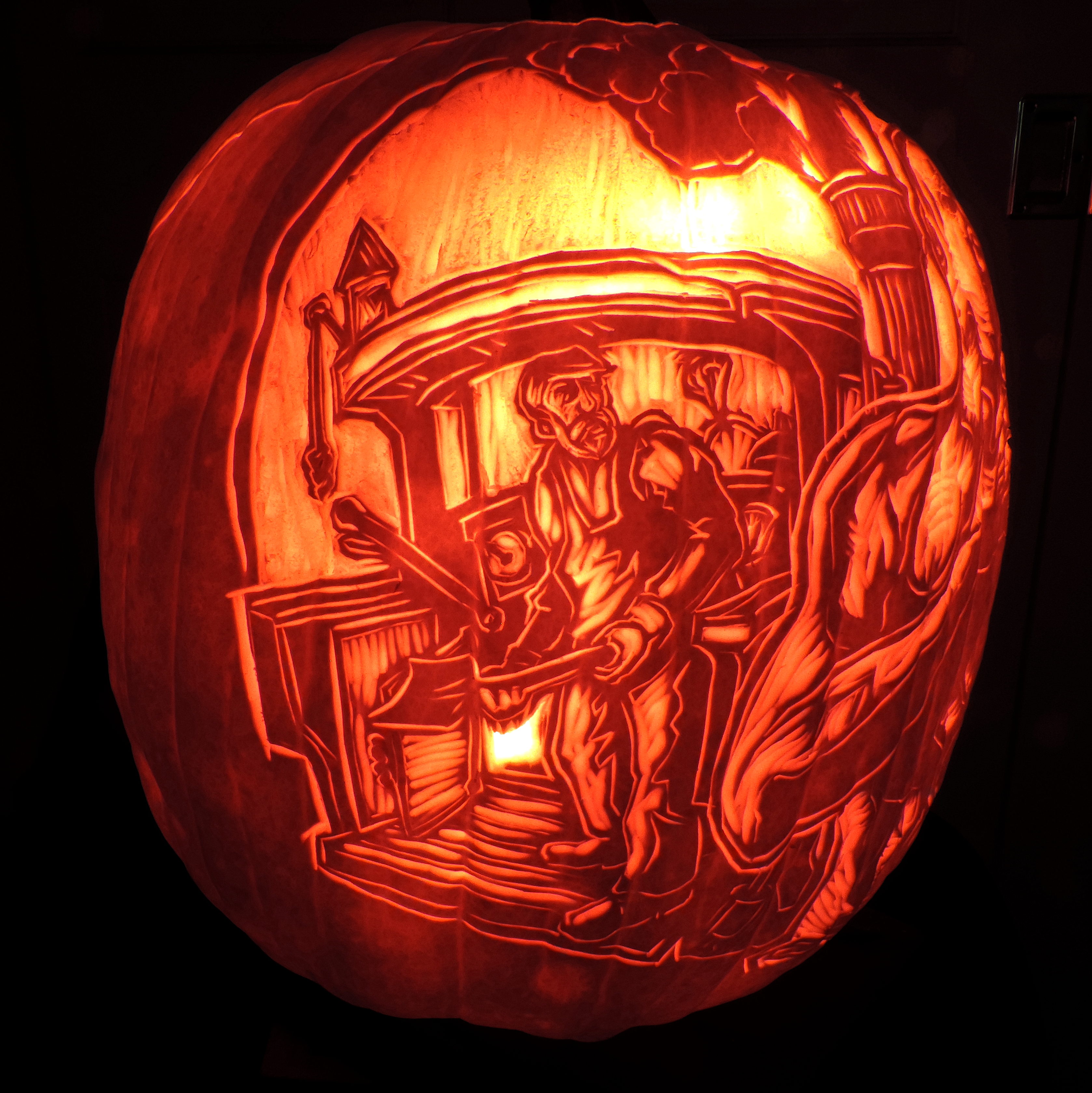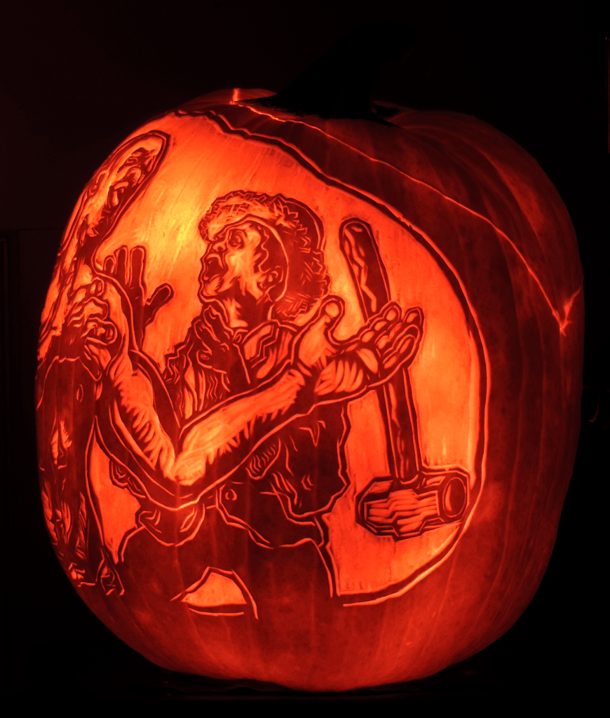 My Jack o’ Lantern illustrates the climactic moment of the legend: John Henry has just won his race against the steam drill, which is shown at left the image above. But just then, his heart gives out — and he grimaces as pain shoots through his chest and left arm.