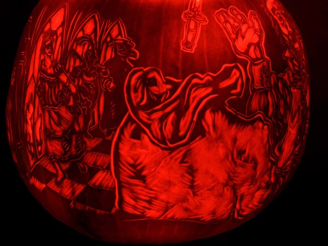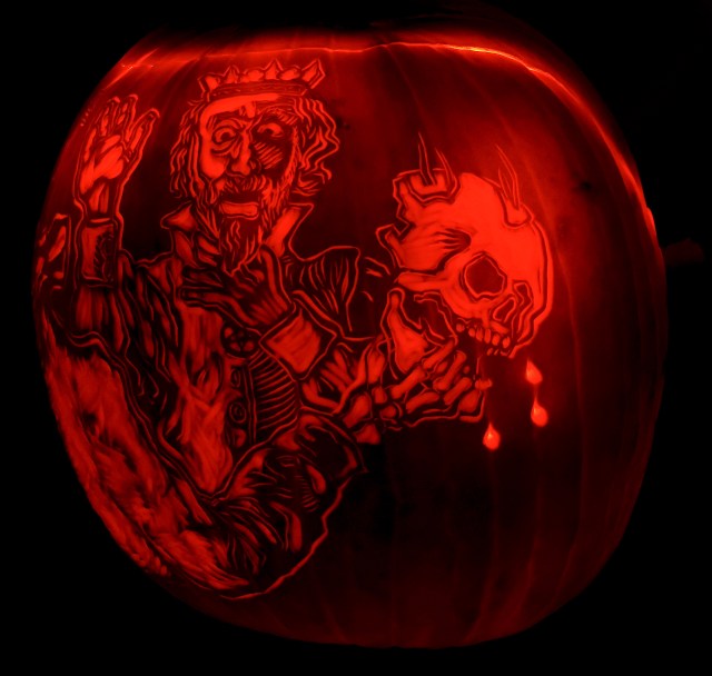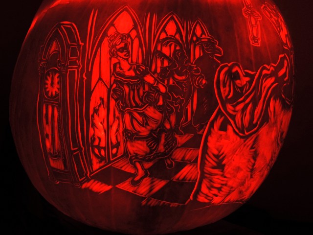 Gaiety prevailed, except when the large ebony clock chimed the hours in an ominous manner. As midnight approached, the prince became aware of disquiet and alarm among his guests — one among them was dressed not in finery but in a shroud, with a mask like a death’s head. The prince could see this unwelcome guest was in the guise of a victim of the Red Death! This was infuriating — ruining the rollicking mood of his ball with this horrible reminder of what lurked outside the walls. Drawing his dagger, the Prince pursued the zombie-like figure into the innermost chamber of his palace — a black room luridly lit by a fire shining thru gothic windows, glazed in red glass. But as the prince moved to strike, the figure pulled away its death-mask to reveal… Nothing! There was no face behind the mask, no person within the shroud-like mantle — nothing but an insubstantial specter. The prince was terrified for a moment — before he dropped his dagger and *fell dead from the plague!* For this specter was the personification of the Red Death itself, come to take revenge on the heartless Prince and the selfish subjects surrounding him.